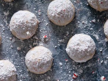 A festive take on Mexican Wedding Cookies with peppermint candies and extract