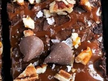 Fudgy brownies topped with homemade salted caramel, pecans, chocolate chips, and salt.